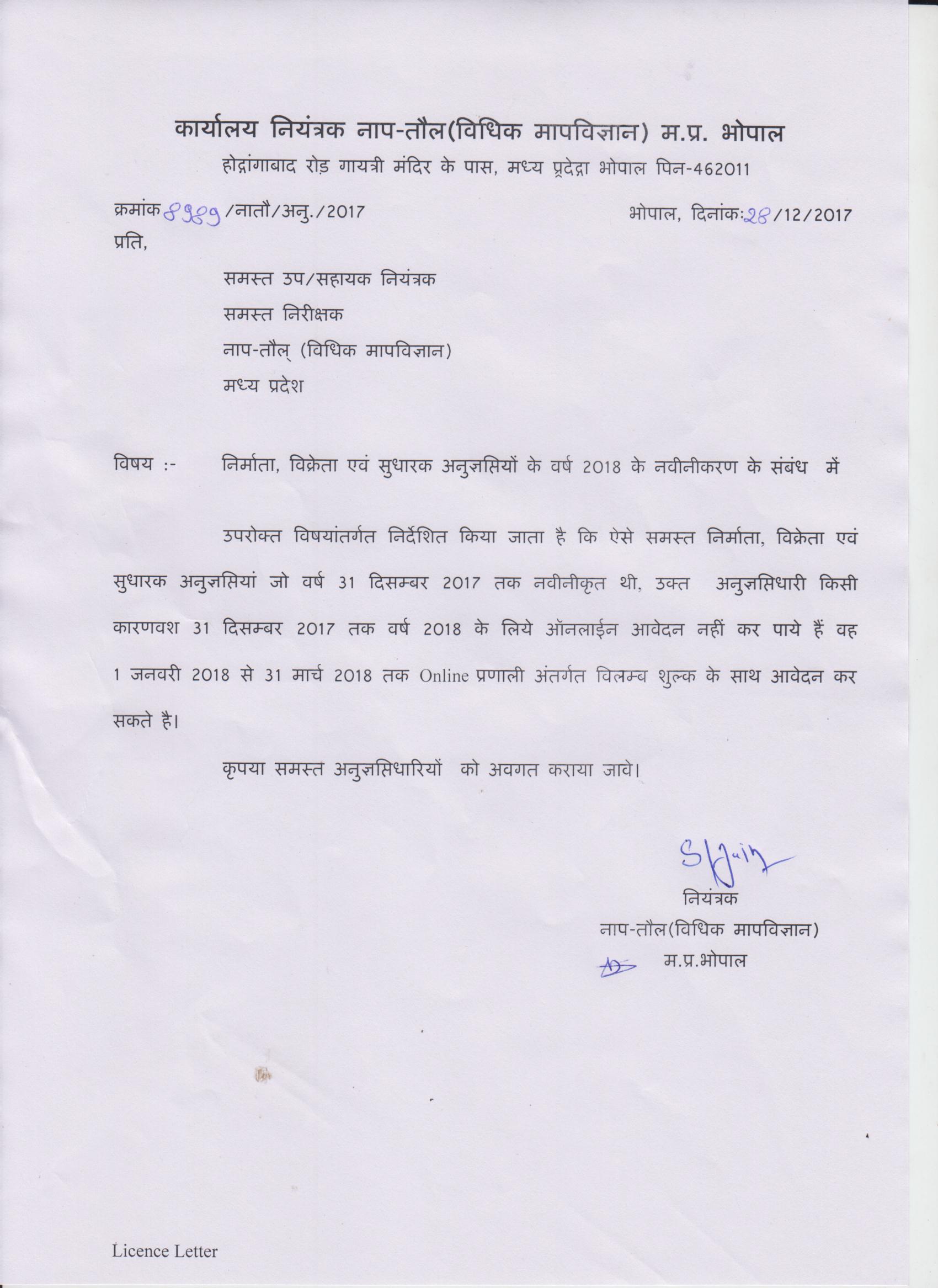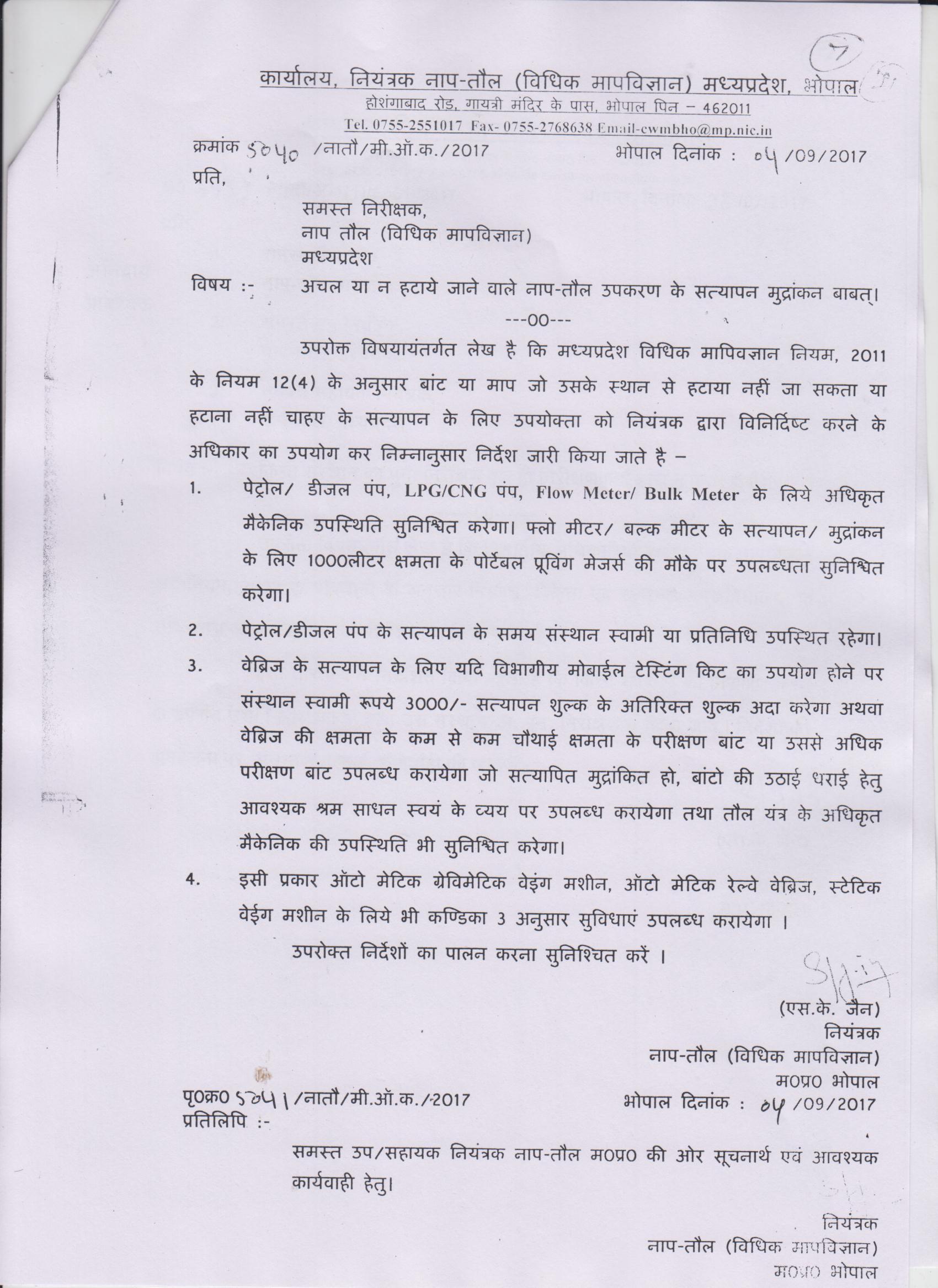 नाप-तौल उपकरणों के मूल मुद्रांकन पश्चात सत्यापन प्रमाण पत्र जारी करने के संबंध में । |