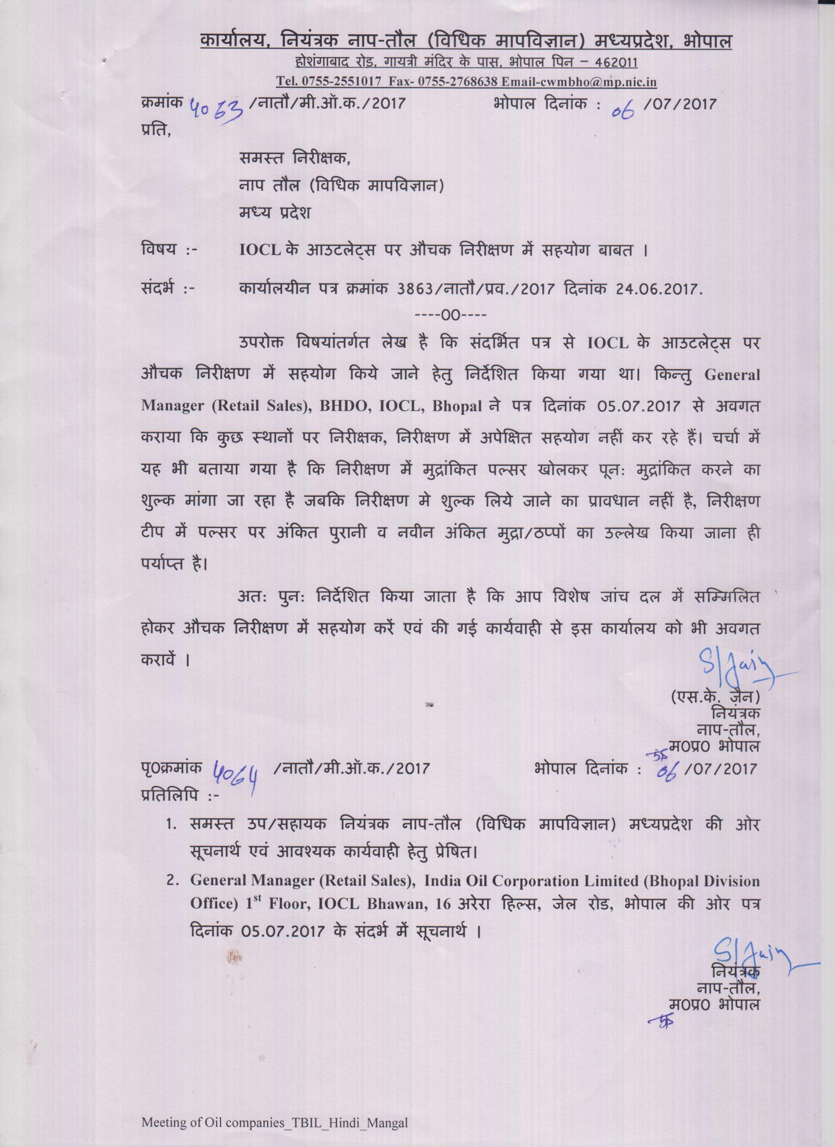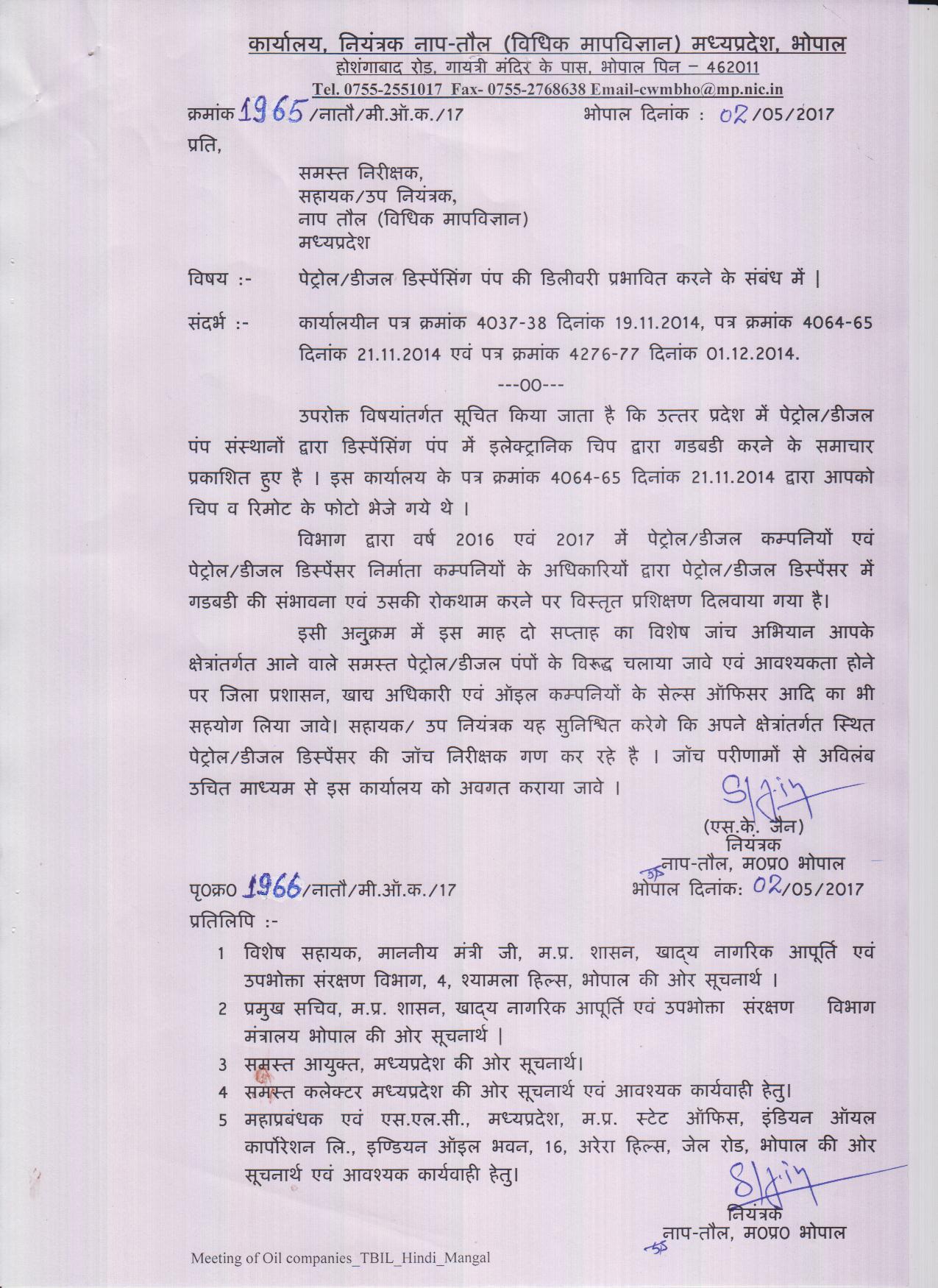 क्षेत्रांतर्गत आने वाले पेट्रोल/डीजल पंपों का वर्ष में प्रत्येक तीन माह में एक बार निरीक्षण कर जांच करने बाबत । |