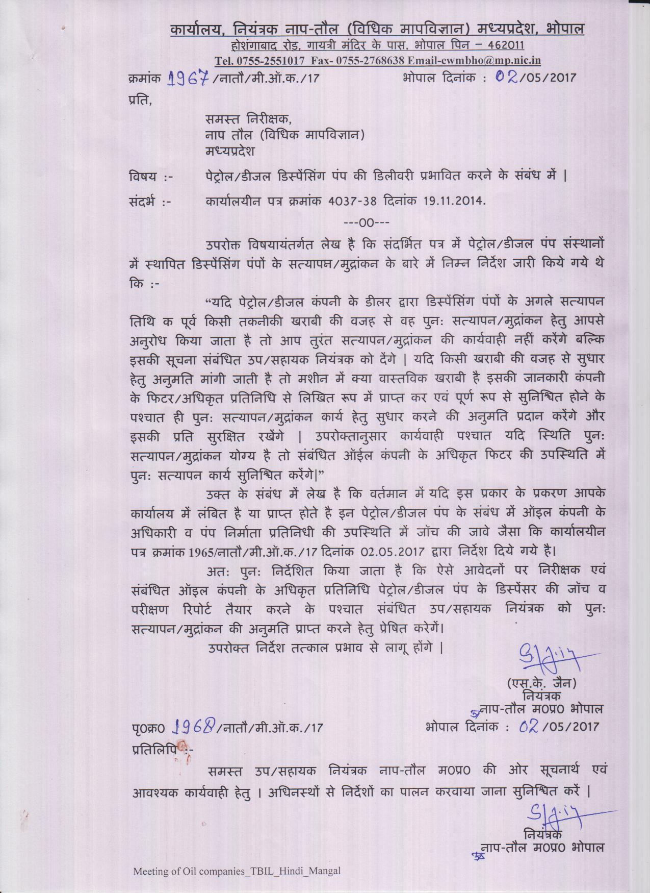 पेट्रोल /डीज़ल डिस्पेंसिंग पंप के "इलेक्ट्रॉनिक पुर्जो की सीलिंग-सत्यापन अवं मुद्रांकन" की प्रक्रिया के संबंध में । |