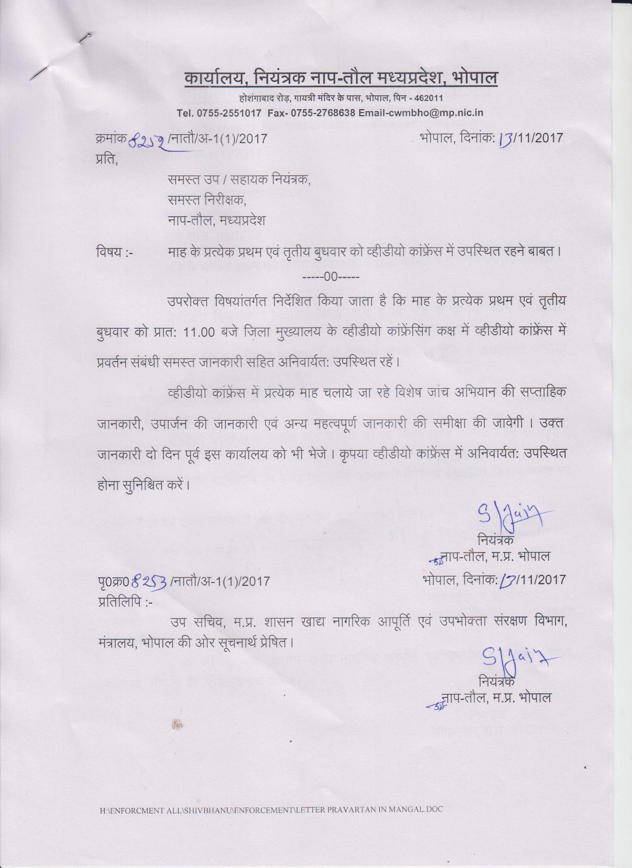 माह के प्रत्येक प्रथम एवं तृतीय बुधवार को व्हीडीयो कांफ्रेंस में उपस्थित रहने बाबत. |